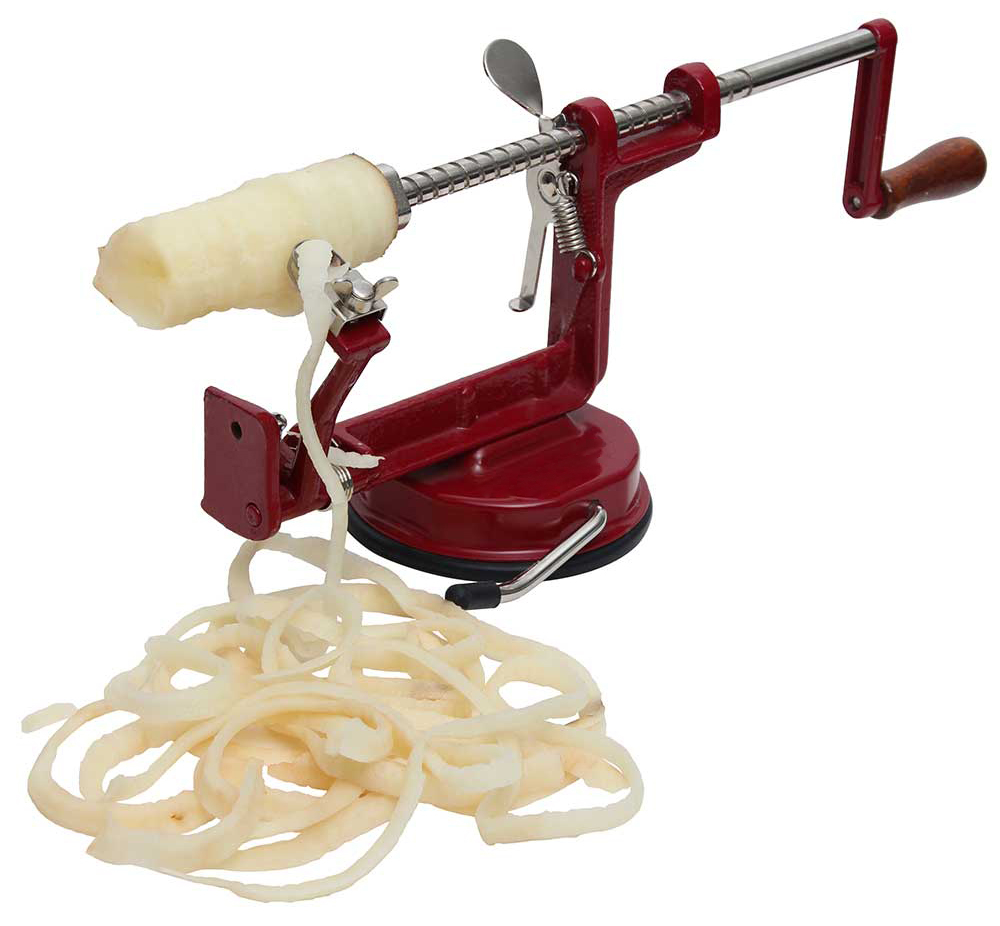 The Johnny Apple Peeler allows you to adjust the peeling blade. You can adjust it to cut deeply and use it on your potatoes to make shoe string potatoes.